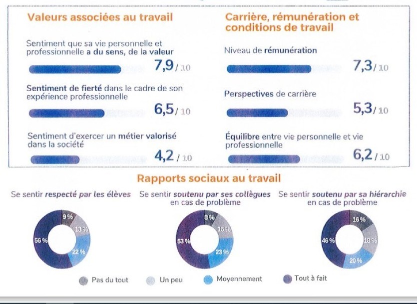 "Leur satisfaction est évidemment bien plus grande sur le niveau de rémunération avec une appréciation deux fois meilleure ici qu'en France. Parmi les autres points positifs, il y a un sentiment d'être respecté par les collègues, les élèves ou la hiérarchie ainsi qu'une vraie fierté à exercer leur métier qui est porteur de sens et de valeurs", résume Véronique Ujicas.