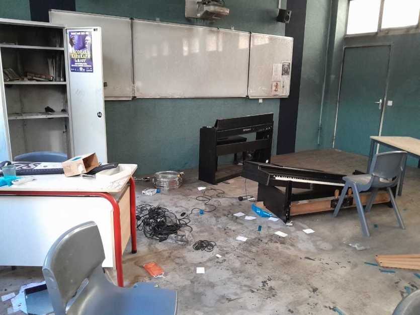 Au collège de Rivière-Salée, même la salle de musique a été saccagée. Photo Anthony TejeroÀ ses côtés, Frédéric opine du chef. "En tant qu’enseignant, on se doit de rester neutres. Notre but, c’est la transmission pour qu’ils ressortent de l’école avec un diplôme, estime ce professeur de technologie. J’ai vu certains de mes élèves sur les barrages, mais je garde à l’esprit que cela reste des enfants et qu’ils ont sans doute été poussés par d’autres, avec peut-être des pressions. Je les considère avant tout comme des élèves à qui je dois le respect. Et inversement."