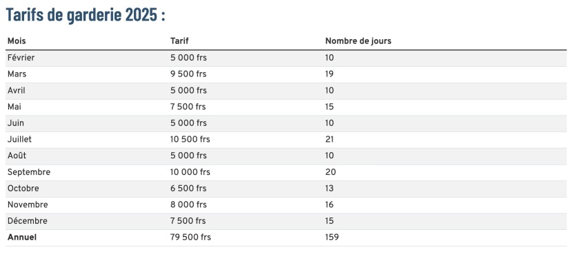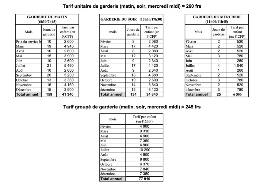 Tarifs de la garderie à Nouméa pour l’année 2025. Photo Ville de NOuméaLa garderie est ouverte à 6h45 tous les jours, le mercredi jusqu’à 11h45 et le soir, sauf le mercredi, jusqu’à 17h30. Pour les 159 jours de garderie, la mairie de Nouméa facture 79 500 F par enfant.