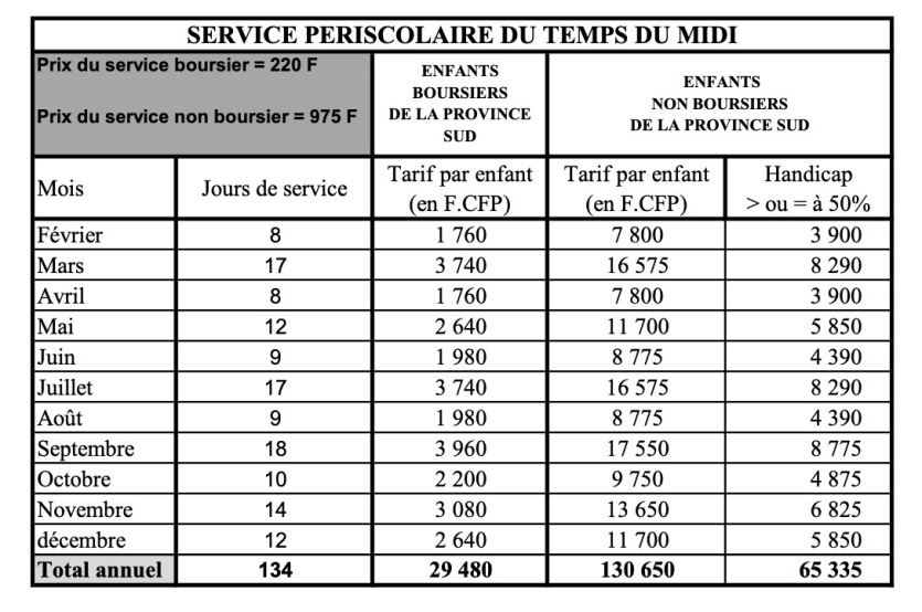 Photo Ville de PaïtaPour les 134 repas, la mairie de Païta facture 125 000 F à l’année pour un enfant, et 50 000 F pour les 159 jours de garderie.