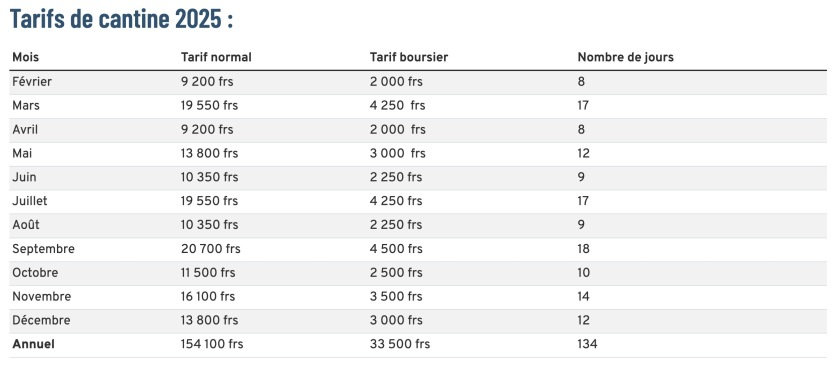 Tarifs des cantines à Nouméa pour l’année 2025. Photo capture d'écran / Ville de NouméaPour l’année est ses 134 repas, la Caisse des écoles facture 154 100 F par enfant. Les enfants boursiers sont à 33 500 F à l’année.