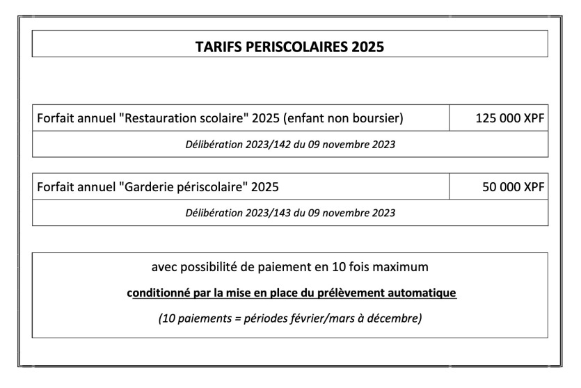 Il est obligatoire d’adhérer à la caisse des écoles au tarif de 1 000 F par foyer à l’année.