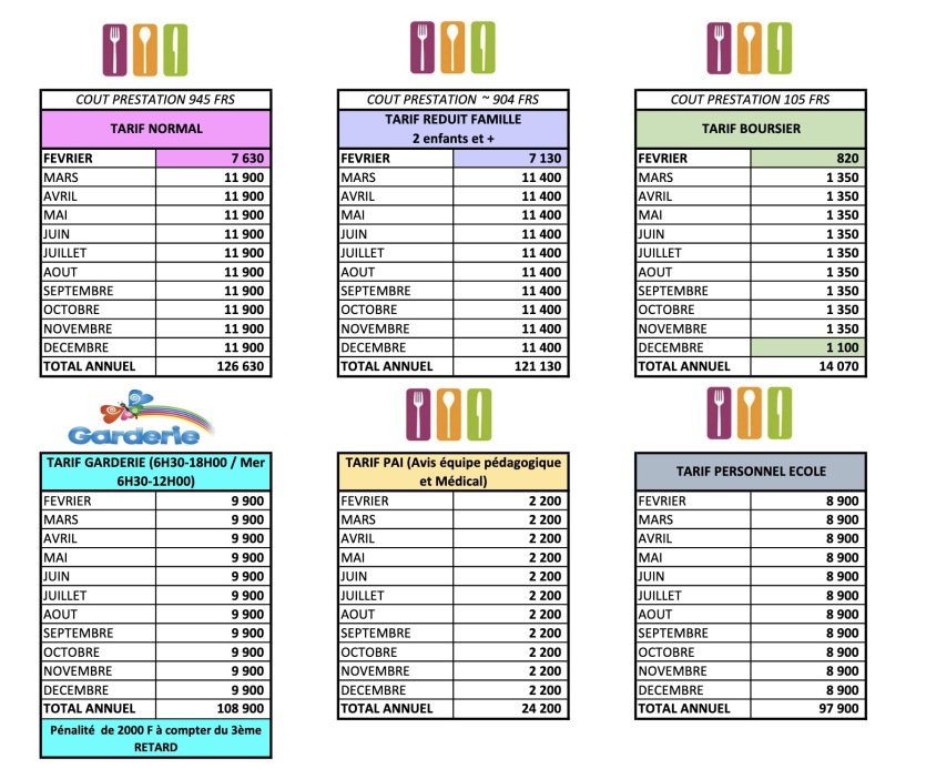 Tarifs de la cantine à Dumbéa PhotoVille de DumbéaIl est obligatoire d’adhérer à la Caisse des écoles au tarif de 2 500 F par foyer à l’année.