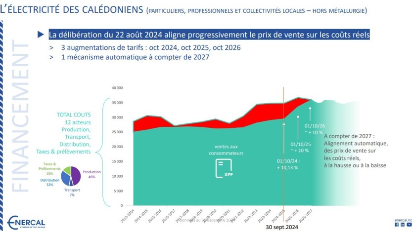 À partir de 2027, le prix de vente de l’électricité sera automatiquement aligné sur le coût réel, qu’il soit à la hausse ou à la baisse. Infographie EnercalPour ce faire, le document prévoit trois augmentations de tarif de 10 %. Une première est passée en octobre 2024, une autre est prévue en octobre cette année, et une dernière en octobre 2026. À partir de 2027, les Calédoniens paieront le "juste prix" de l’électricité, qui sera réajusté à la hausse ou à la baisse chaque trimestre, en fonction des évolutions du coût de production, à l’image de ce qui existe pour le carburant. "À l’issue de la phase de transition, on aura un système à l’équilibre", affirme Jean-Gabriel Faget.