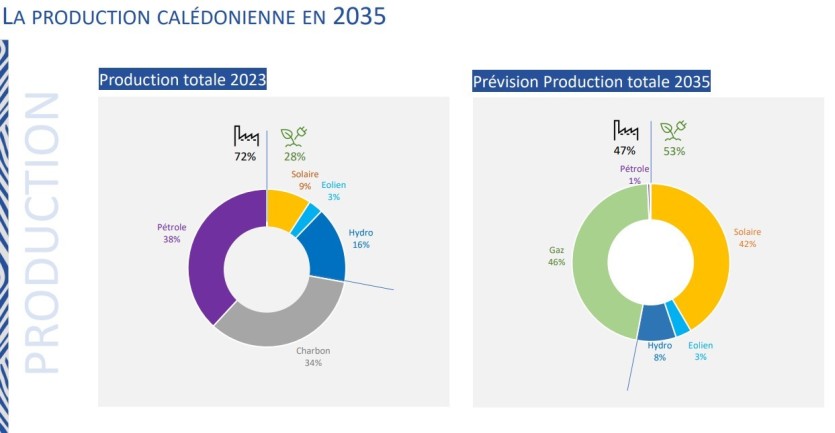 Les projections prévoient le développement du solaire, à condition de créer des moyens de stockage, batteries et surtout STEP. Infographie EnercalLa priorité reste le développement de moyens de stockage. Une nécessité pour continuer à faire croître la part du photovoltaïque, puisque sans stockage, le solaire produit en journée mais non utilisé est perdu, ce qui pèse sur les coûts de production. "On a atteint, il y a deux ou trois ans, les limites de la capacité de consommation de la distribution publique. L’énergie solaire produite est, à certains moments, trop abondante par rapport à la consommation des Calédoniens. Un surplus que nous vendons parfois à la SLN", détaille Jean-Gabriel Faget.