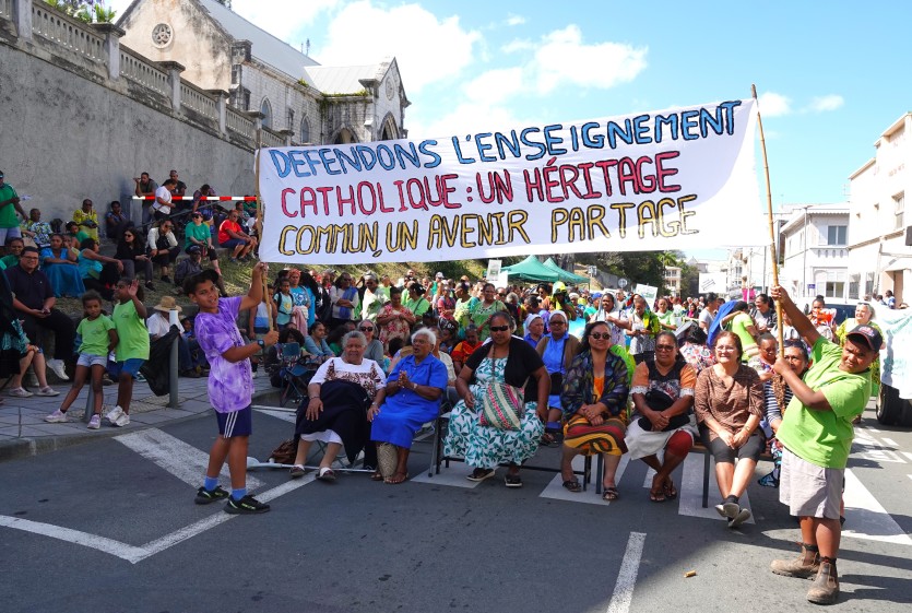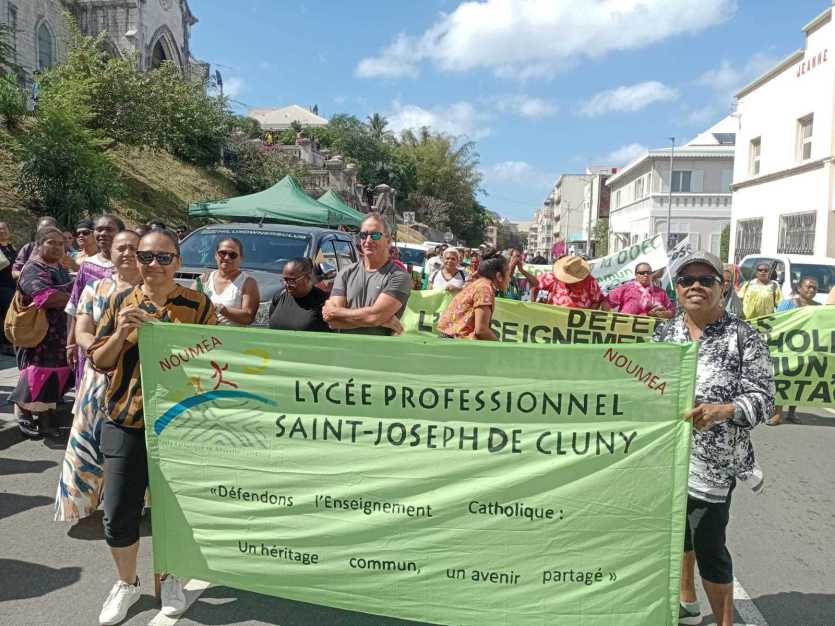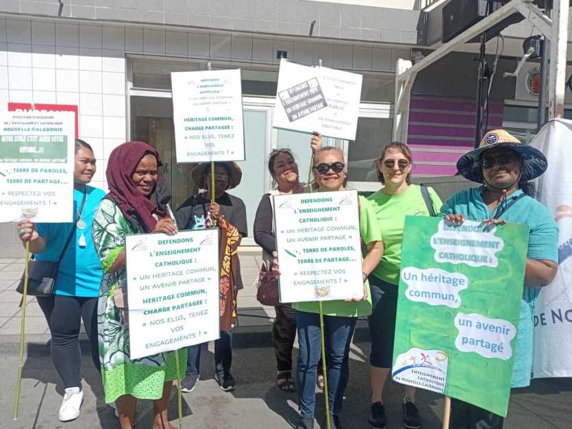 Pendant qu'une délégation de la Ddec était reçue au Congrès, les personnels manifestaient devant l'institution.Le 12 mai 2023, les équipes de la Ddec s’étaient déjà mobilisées dans les rues de Nouméa, rassemblant près de 7 000 personnes, pour alerter sur la situation financière délétère de l’enseignement catholique en Nouvelle-Calédonie. Dans la foulée, le Congrès avait adopté une délibération, visant notamment à accompagner les besoins en financement pour les dépenses d’investissement et de fonctionnement, de restauration et d’internat.