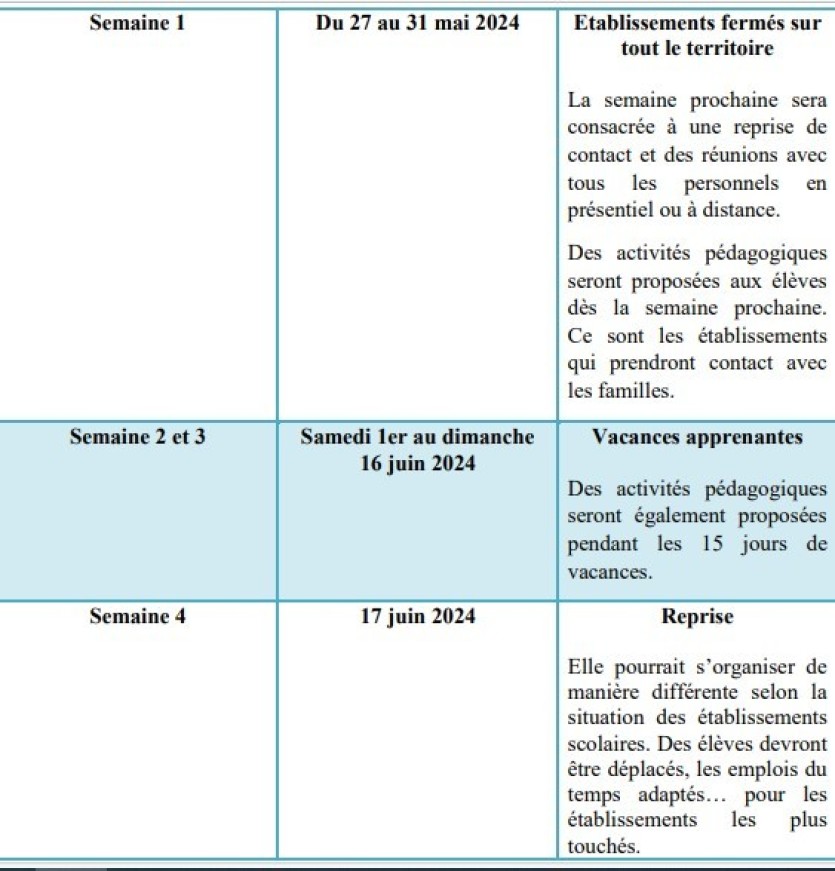 - Anthony Tejero | Crée le 24.05.2024 à 21h15 | Mis à jour le 24.05.2024 à 21h25ImprimerIsabelle Champmoreau a co-animé uen conférence de presse, ce vendredi 24 mai, à la présidence du gouvernement. Photo Anthony TejeroAvec 35 établissements scolaires partiellement ou totalement détruits dans l’agglomération, la reprise des cours ne se fera pas sans mal. Alors que les difficultés d’approvisionnement en carburant ou en nourriture et que la sécurité et la liberté de circulation ne sont pas rétablies partout, le gouvernement annonce que la rentrée n’est pas prévue avant le lundi 17 juin. Un délai qui doit notamment permettre de trouver une solution pour les 5 000 élèves impactés par ces dégâts.