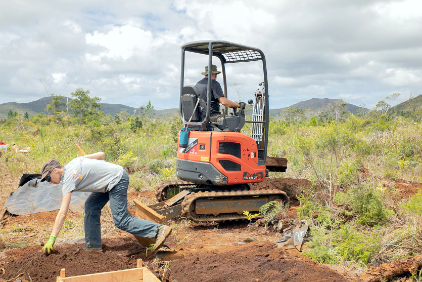 Serge Didier creuse une fosse à deux étages dans lesquels des gouttières seront installées.Cette eau récoltée intéresse tout particulièrement l’équipe de l’Institut agronomique néo-calédonien (IAC), menée par la chercheuse Audrey Leopold. Son analyse permettra de mesurer les éléments retenus, ou au contraire "relargués" en profondeur, par le sol, au pied du kaori. Matière organique dissoute, métaux, éléments nutritifs… l’équipe regarde tout en détail. Elle cherche notamment à vérifier si un compost végétal produit localement, naturellement chargé en métaux, peut être utilisé dans l’agriculture.