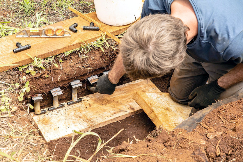 Serge a l’habitude, il sait que ce qu’il a à faire. Aux manettes de la tractopelle, il creuse une fosse à deux étages, l’un à 80 centimètres de profondeur, l’autre à 1m20, juste au pied d’un jeune kaori. Ses collègues, Bernard et Arnaud travaillent sur une autre fosse, creusée un peu plus tôt dans la matinée. Eux aussi déroulent une mécanique qui semble bien huilée. Pour chaque étage de la fosse, ils installent quatre gouttières, des sortes de rigoles en polyéthylène.
