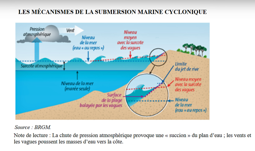 Le rapport relève que le recul du trait de côte n’est pas pris en compte dans les politiques publiques actuelles comme un risque naturel majeur, tout comme les échouements d’algues sargasses aux Antilles. Pourtant, le premier phénomène présente des risques de submersion marine, et le deuxième a un lourd impact sur les écosystèmes et les populations des régions en question. Dans les deux cas, ils nécessitent un renfort accentué de l’État et de toutes les institutions concernées (voir les recommandations plus bas). De même, les projets de relocalisation d’habitats ou de restauration des écosystèmes côtiers sont insuffisamment pris en compte, d’après la commission.
