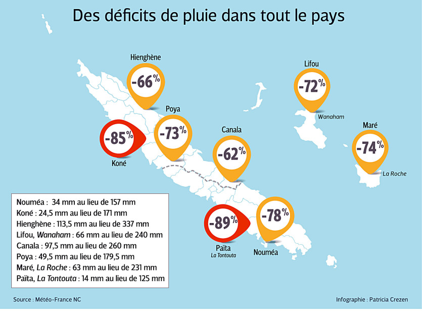 - Alors que cette période est généralement la plus pluvieuse de l'année, le mois de mars a été particulièrement sec. Si les déficits hydriques sont enregistrés sur l'ensemble du pays, la côte Ouest est la plus touchée par ce manque d'eau. Explications.La météo a parfois de quoi jouer avec les nerfs. En témoignent les vacances de janvier et de février qui ont rarement été autant pluvieuses, alors que mars, synonyme de confinement strict, a quant à lui été l'un des plus radieux jamais enregistrés en Nouvelle-Calédonie. Du moins dans laIl vous reste 93% de l'article à découvrir.Cet article est réservé aux abonnés.