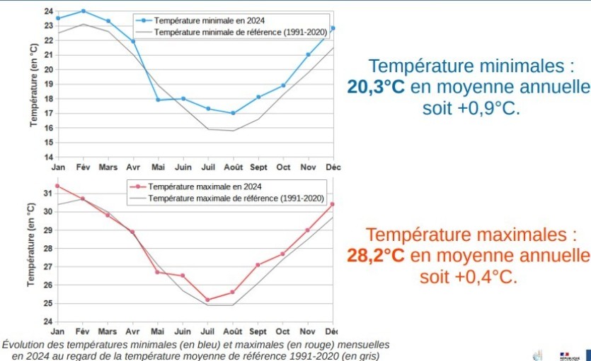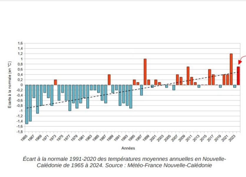 Écart à la normale 1991-2020 des températures moyennes annuelles en Nouvelle-Calédonie de 1965 à 2024. Source Météo FranceDans le détail, "les nuits ont été anormalement douces", c’est-à-dire que ce sont les températures minimales qui se réchauffent le plus, avec une moyenne de 20,3°C à l’échelle du Caillou, soit + 0,9°C, tandis que les maximales atteignent 28,2°C, soit + 0,4°C.