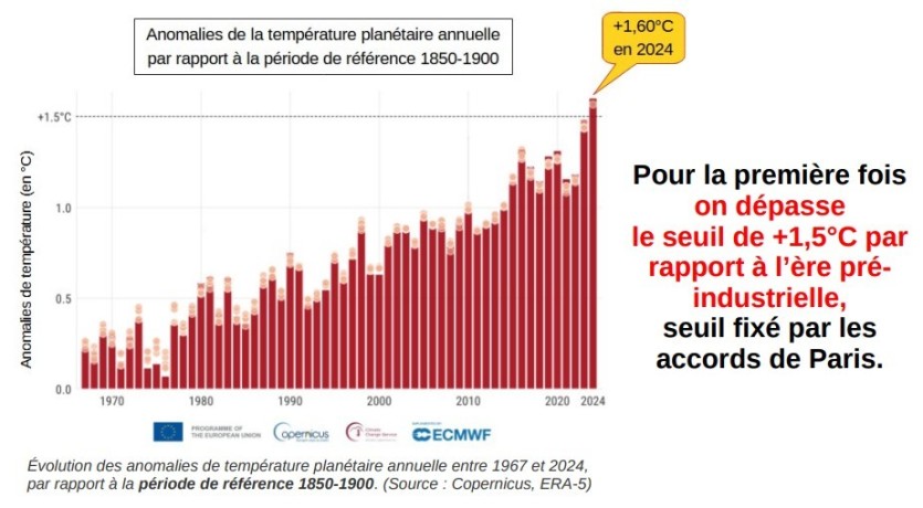 Évolution des anomalies de température planétaire annuelle entre 1967 et 2024, par rapport à la période préindustrielle, 1850-1900. Source Copernicus / Météo FranceDes températures toujours plus élevées