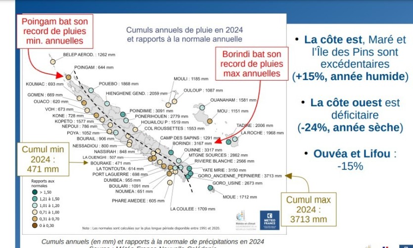 "Nous relevons aussi une importante différence saisonnière, avec des pluies en saison humide qui ont été conformes aux normales au début de l’année 2024, et supérieures aux normales avec l’apparition de La Niña en toute fin d’année, mais la saison hivernale, de mai jusqu’à septembre, a été l’occasion d’une sécheresse qui a touché l’ensemble du pays, et plus sévèrement la région nord-ouest de la Grande Terre, avec plus de 60 % de déficit de pluie sur cette période", précise Thomas Abinun.