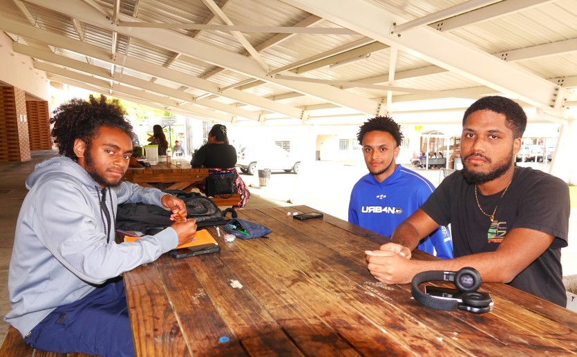 Axel, 17 ans, de Houaïlou, Enzo, 18 ans, du Vanuatu et Gabriel, 19 ans, de La Foa, ont encore du mal à "prendre conscience de l’urgence" autour du réchauffement climatique, bien qu’ils jugent le sujet "inquiétant". Photo Anthony TejeroDes discours loin de surprendre Georgina Sioremu, étudiante et chargée de médiation scientifique à l’IRD (Institut de recherche pour le développement), qui s’intéresse notamment au positionnement de la jeunesse sur ce sujet.