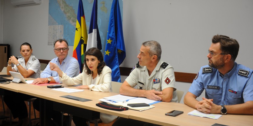 De gauche à droite, Marjorie Ghizoli, directrice de la police nationale, Yves Dupas, procureur de la République, Anaïs Aït Mansour, directrice de cabinet du haut-commissaire, Yann Latil, général commandant les forces armées de Nouvelle-Calédonie et Cédric Rollet, directeur des douanes, lors de la conférence de presse donnée vendredi 4 juillet dans l’après-midi sur l’opération Dante. Photo A.-C.P.Un bateau sans nationalité