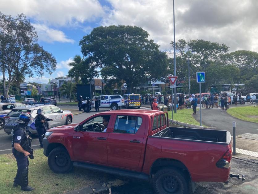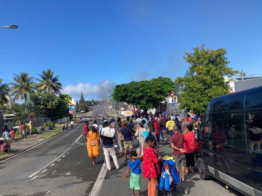 Devant le Leader Price Magenta, pendant que le barrage et les feux près des Tours se poursuivent, la population attend l’ouverture du magasin. Photo Baptiste GouretPendant ce temps, un important cortège de véhicules policiers et militaires emprunte le rond-point de Magenta en direction de l'aérodrome.