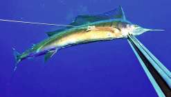 Le voilier de I’Indo-Pacifique (son vrai nom) transperce le brouillard de particules qui flottent dans l’eau, il ralentit devant le plongeur. Il n’est plus qu’à deux mètres de lui. Figé, Éric Boucard, « paniqué et en même temps très concentré », « vise plein corps, de biais ». La flèche traverse l’espadon de part en part, « c’est un tir très pénalisant ». Armé d’un fusil de 130 centimètres, la flèche étant reliée à une ligne flottante avec une bouée à l’extrémité (technique de la floatline qui permet « de pêcher des poissons impossibles à négocier humainement en raison de leur force »), le pêcheur est alors tracté sur plusieurs dizaines de mètres. Éric Boucard remonte ensuite sur son bateau, aidé par Alain. Il tient d’une main ferme la corde qui le relie à l’espadon à l’impressionnante nageoire dorsale. Le combat est âpre. Le Mondorien, père de deux enfants, ne lâche rien. « Le bateau, moteur coupé, avançait, tiré par ce poisson pour l’instant infatigable, se rappelle-t-il. Après 10 minutes, il est en visuel, quelques mètres sous la surface ». C’est le moment pour Éric Boucard. Il replonge et pique une seconde fois l’espadon-voilier sous les ouïes. « Le tir suffit à le sécher net ». Il faudra cinq minutes pour hisser le pélagique sur le bateau. Éric Boucard est aux anges. « J’ai pêché le poisson de ma vie ».