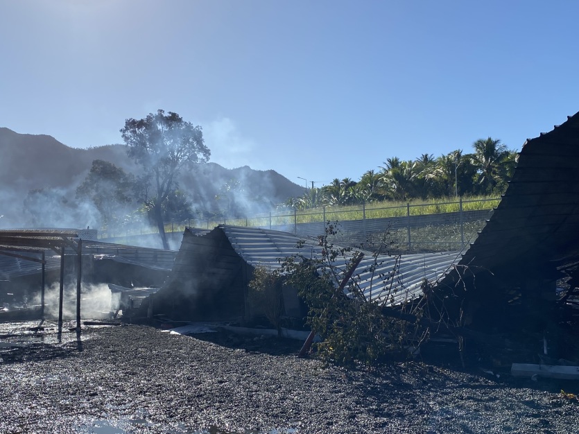 Les rayons de soleil filtrent au travers de la fumée qui se dégage encore des décombres de l’école Baptiste-Gustin, au nord de la commune de Païta. C’était la plus récente de la ville, et comptait 293 élèves de maternelle. Ce matin très tôt, une partie de l’établissement scolaire a été détruite par les flammes. "J’ai devant moi un spectacle que je ne peux pas qualifier, exprime douloureusement Marilyne D’Arcangelo, maire de Païta. C’est incompréhensible ! J’ai la rage. Comment peut-on punir des enfants ?" Quatre salles de classe, quatre interclasses, deux salles de sieste et deux salles de motricité ont été détruites, malgré l’intervention des pompiers à l’aube. "Nous avons eu des difficultés à sortir du village ce matin pour intervenir, déplore le major Steeve Slamat. Il y avait un barrage à Ondémia, un autre à Karikouié, nous avons dû passer dans les lotissements pour nous rendre sur place."