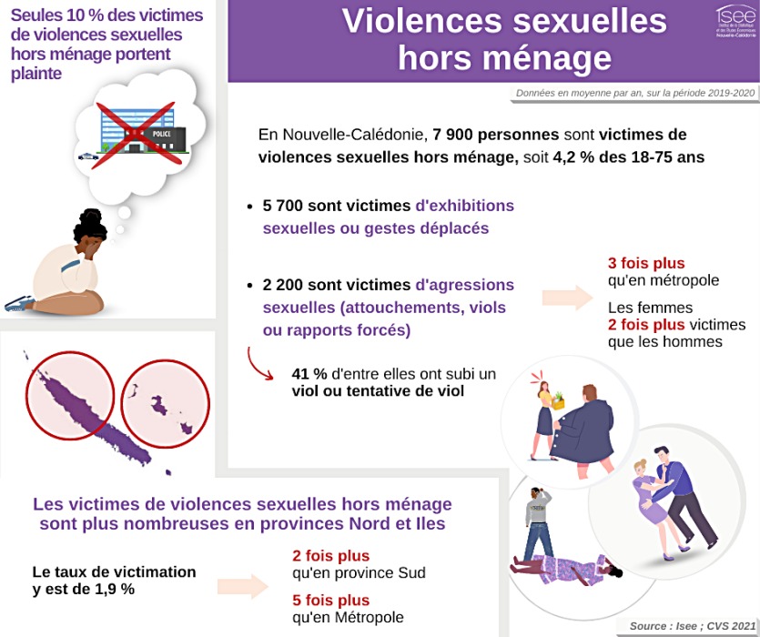 - Dans le cadre de la semaine de lutte contre les violences faites aux femmes, l'Isee rapporte le constat des violences sexuelles. Celles-ci sont bien plus nombreuses qu'en Métropole.Hors ménage, 67 % des victimes sont des femmes Le rapport Cadre de vie et sécurité 2021 dévoile qu'en moyenne 2 200 personnes ont été victimes d'agressions sexuelles (attouchements, viols, rapports forcés) de la part d'une ou plusieurs personnes ne vivant pas au sein du ménage, soit 1,2Il vous reste 90% de l'article à découvrir.Cet article est réservé aux abonnés.