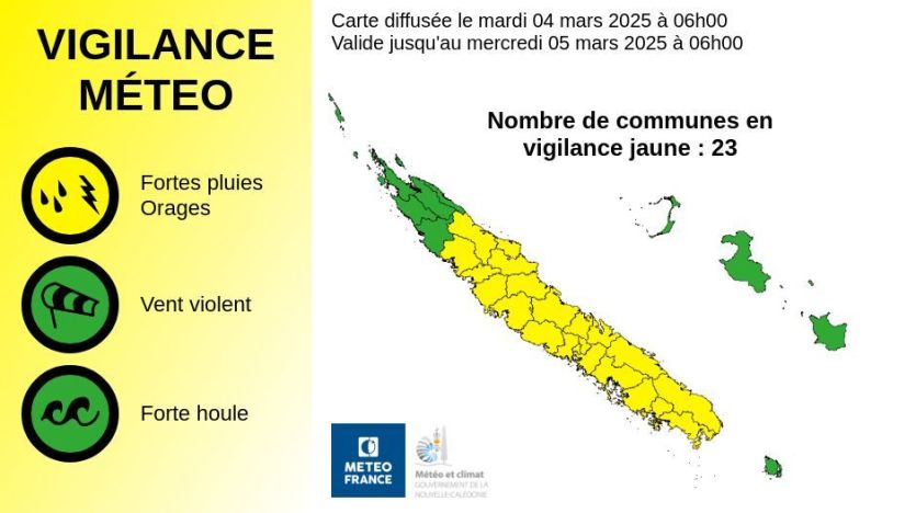 Météo France place 23 communes en vigilance jaune aux fortes pluies du sud de la Grande Terre jusqu'à Voh et Hienghène. Ces précipitations sont d'ailleurs d'abord attendues dans le Nord avant de se décaler progressivement vers le Sud.
