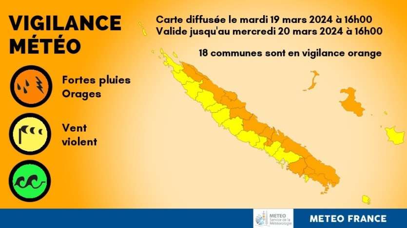 La côte Est, le Grand Nouméa ainsi que les communes de Sarraméa, Farino, Lifou et Ouvéa ont été placées en vigilance orange aux fortes pluies et aux orages par Météo France NC. Une alerte en vigueur depuis ce mardi matin, jusqu’à ce mercredi 20 mars, 16 heures.