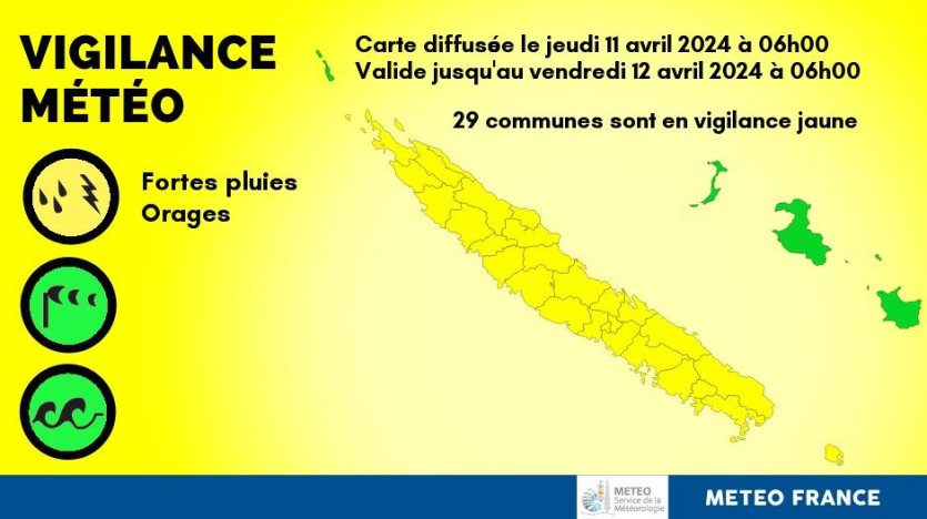 Météo France émet ce mardi 11 avril, une vigilance jaune aux fortes pluies pour des précipitations modérées localement orageuses sur l'ensemble de la Grande Terre et sur l'île des Pins. Une alerte maintenue jusqu'à demain, vendredi, à 6 heures.