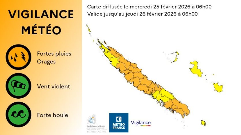Météo France a placé 22 communes en vigilance orange aux fortes pluies et aux orages, ce mercredi 25 février. Carte Météo FranceAu cours des 12 dernières heures, les cumuls de pluie les plus importants relevés ont été à la Montagne des Sources (145 mm), à Dumbéa (100 mm), à Nouméa (93 mm) et à Houaïlou (78 mm). Des précipitations sont une nouvelle fois attendues ce mercredi sur la Grande Terre, avec des cumuls de l’ordre de 50 à 70 mm sur 6 heures, qui s’ajouteront aux pluies précédentes.