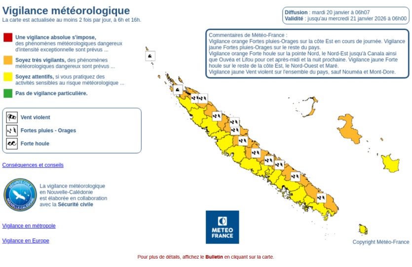 - Julien Mazzoni | Crée le 20.01.2026 à 10h28 | Mis à jour le 20.01.2026 à 10h28ImprimerCarte satellite de la région du mardi 20 janvier à 10 heures. Photo Météo-France NCLe pays est placé ce mardi 20 janvier sous plusieurs niveaux de vigilance météorologique. Fortes pluies, orages, vent soutenu et dégradation de l’état de la mer sont attendus, en particulier sur la côte Est et le Nord, où la Sécurité civile appelle à la plus grande prudence.