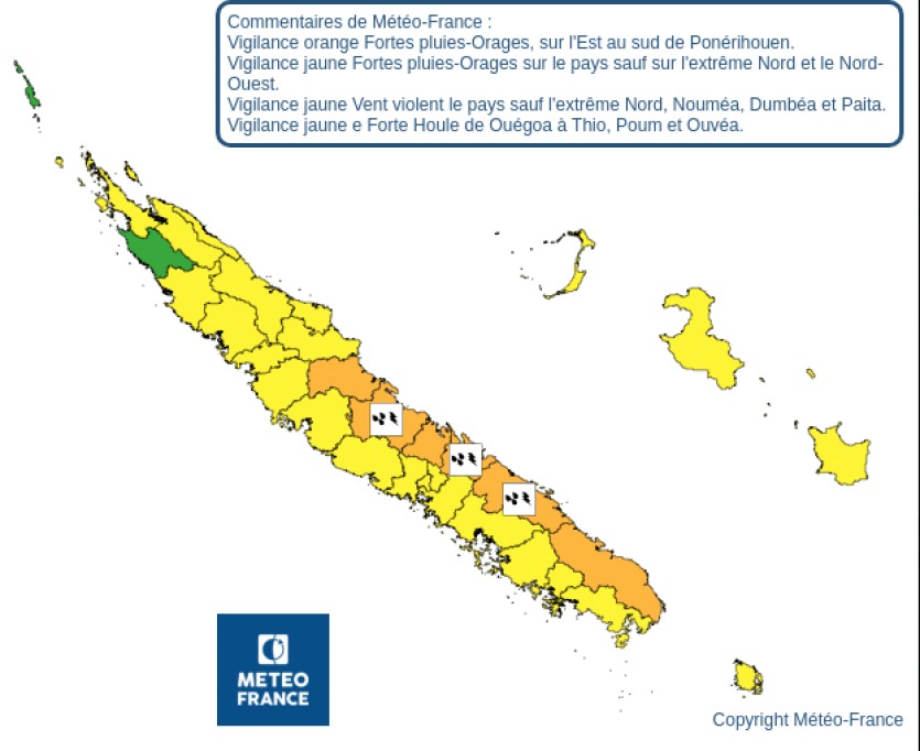 - Julien Mazzoni | Crée le 24.03.2026 à 07h56 | Mis à jour le 24.03.2026 à 07h57ImprimerPlusieurs communes de la côte Est sont placées en vigilance orange fortes pluies. Météo-France NCUne vigilance orange pour fortes pluies et orages est en cours ce mardi 24 mars sur une partie de la côte Est et du Sud, où des risques de crues et de débordements sont signalés par les autorités.