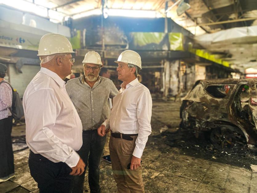 Manuel Valls en discussion avec Yoann Lecourieux, maire de Dumbéa, et Laurent Vircondelet, président de la Fédération du commerce, au milieu de la galerie du Kenu-In dévastée. Photo Julien Mazzoni"Un concentré de toutes les problématiques actuelles et des défis futurs"