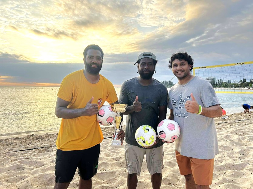 De gauche à droite, Ridge Ue, Manu Citre et Marvin Drawilo. À eux trois, ils ont remporté quatre des cinq éditions des journées Foot NC. Photo Foot NCDiscipline née en 1965 sur la célèbre plage de Copacabana, le footvolley, qui se joue à deux contre deux, devient de plus en plus populaire sur le sable de Nouvelle-Calédonie. La cinquième édition de cet évènement l’a encore démontré : "Nous avons pu compter près de 400 personnes en tout sur la journée, avec un pic de 250 personnes sur les coups de 17h30 au moment des finales", affirme l’organisateur.