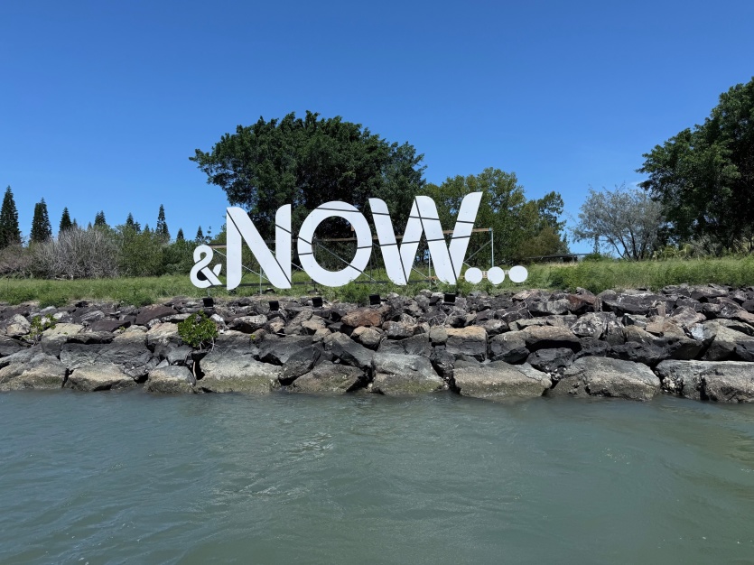 Jamais deux sans trois. Depuis ce week-end, une nouvelle installation monumentale s’est installée en baie de Sainte-Marie, à Nouméa. Après Hope ! (un message d’espoir consécutif aux émeutes) en septembre, puis Think ! (une invitation à penser autrement et "positivement") en décembre, c’est au tour de & Now… de s’illuminer chaque soir sur l’îlot artificiel.