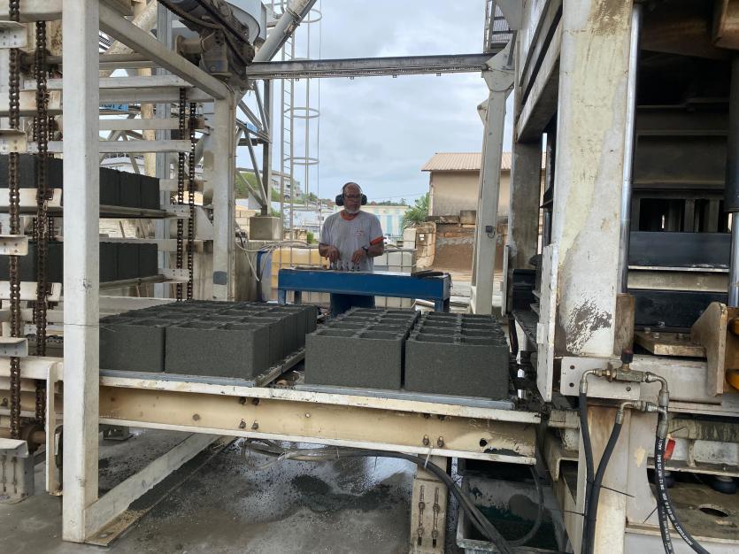 Sobeca produit du béton prêt à l’emploi et des agglos. Sa particularité : l’usage de scorie issue de l’industrie du nickel, achetée à la SLN. Les agglos sont fabriqués "principalement avec de la scorie", quand la concurrence travaille avec du sable. Un choix technique qui a un coût. "La scorie est très abrasive, ça abîme les machines beaucoup plus vite", souligne le directeur. Elle retient aussi moins l’eau : pour compenser, il faut davantage de ciment, l’élément le plus cher du mélange. Résultat : même si la scorie est achetée environ 800 francs la tonne, contre 2 500 à 3 500 francs pour le sable, "au final, ça revient à peu près au même", explique Yannick Mousset.