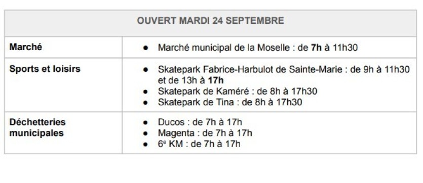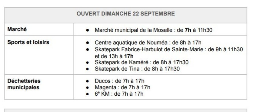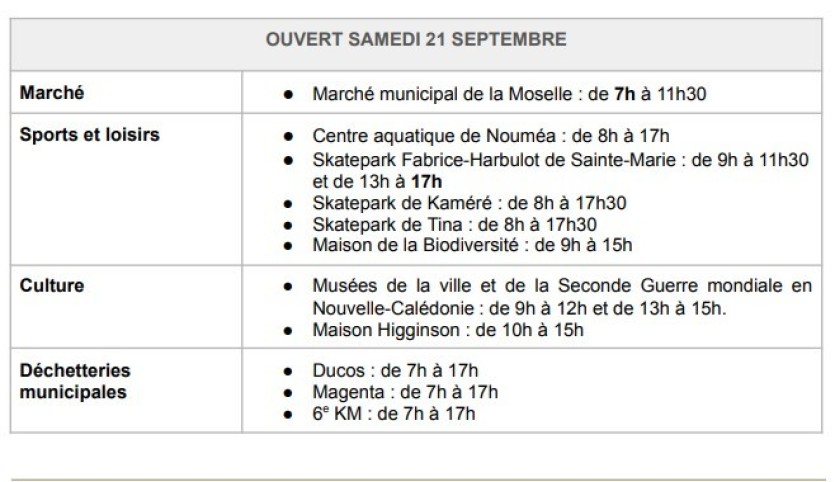 Source : Ville de NouméaLes services municipaux adaptent leurs horaires, au couvre-feu en vigueur de 18h à 6 h du matin, du samedi 21 septembre au mercredi 25 septembre au matin. Certains seront ouverts au public les 23 et 24 septembre. Voici la détail.