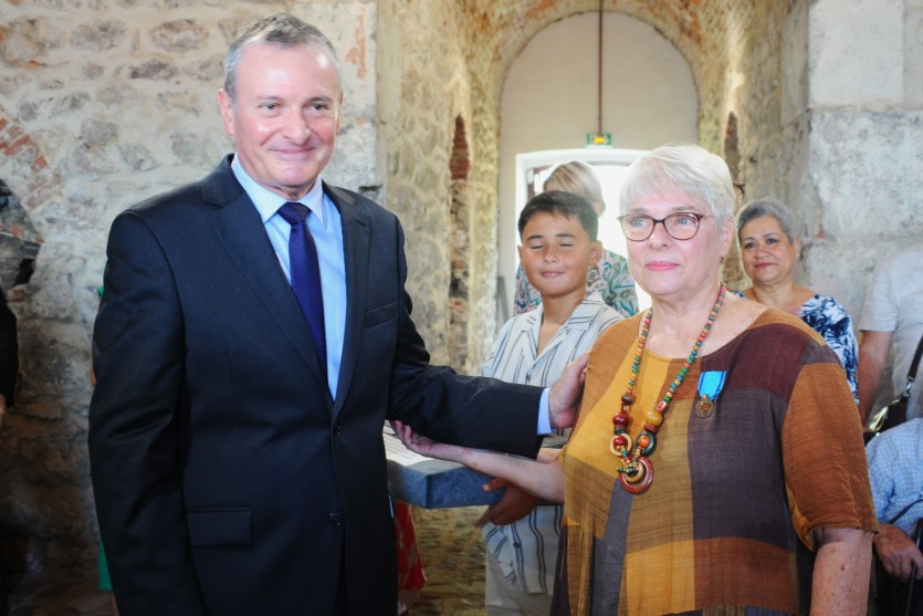 Le haut-commissaire a remis la médaille de l’engagement associatif à Marie-Claire Mary, bénévole depuis trente-quatre ans au sein d’Atup. Photo A.-C.P."C’est un honneur personnel et pour l’association, et puis également une reconnaissance de tout le travail du groupe de récipiendaires et de l’ensemble des bénévoles, qui travaillent parfois dans la discrétion. Je suis adhérente depuis 1992 et membre active depuis 2006. Je participe à toutes les activités de l’association, les visites guidées, les animations, les expositions, la gestion du dock et des objets de collection. Et ça a pris de l’ampleur avec la maison Célières, dont l’Atup est devenue responsable en 2018. On y consacre beaucoup de temps, pas mal d’heures chaque semaine, et on y pense beaucoup aussi, parce que c’est une préoccupation importante. Les choses s’élaborent, même si on n’est pas à son bureau. Sans les bénévoles, il n’y aurait pas tout cela, ils font une grande partie des choses. Il y a parfois des petits moments de baisse de forme, et puis dès qu’on a une idée, une exposition, quelque chose à mettre en valeur, ça repart (rires). C’est une part importante de notre existence."