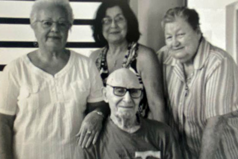 Autour du doyen Désiré Banuelos qui fête ses 94 ans, de gauche à droite : Anita Amadori et Juanita Conzatti, ses nièces, Anita Banuelos-Vigouroux, sa fille adoptive. Cette dernière est bien connue du monde sportif pour avoir remporté en tennis la médaille d’argent par équipes aux Jeux de Port Moresby en 1969 et l’or en double à Guam en 1975. Photo DRJoseph Banuelos, la figure locale