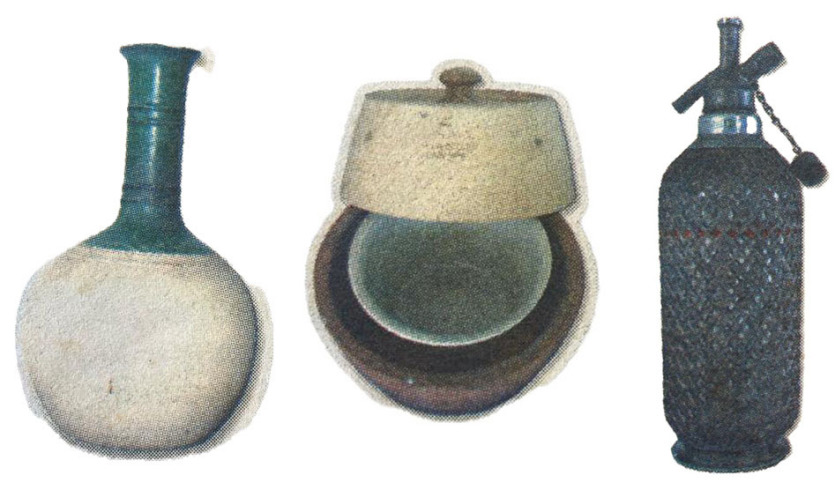 Un objet de luxe : le siphon à eau de Seltz. C’était de l’eau "normale", rendue gazeuse et un peu acidulée par adjonction de gaz carbonique. Cette mise sous pression justifie le maillage métallique autour du verre, pour des raisons de solidité et de sécurité. Dans la bonne société, c’est à l’eau de Seltz qu’on noyait son whisky.