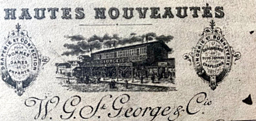 Le magasin St-Georges et Cie, au coin des rues de l’Alma et Clemenceau.W. G. St-Georges et Cie était, au début des années 1900, le plus grand magasin de " nouveautés " de Nouméa. Sa façade principale donnait rue de l’Alma et comme le montre cet entête de facture, il proposait " draperie et confection pour hommes, dames et enfants ", ainsi que de la lingerie et de la bonneterie, des chaussures en tous genres, de la chapellerie, etc.