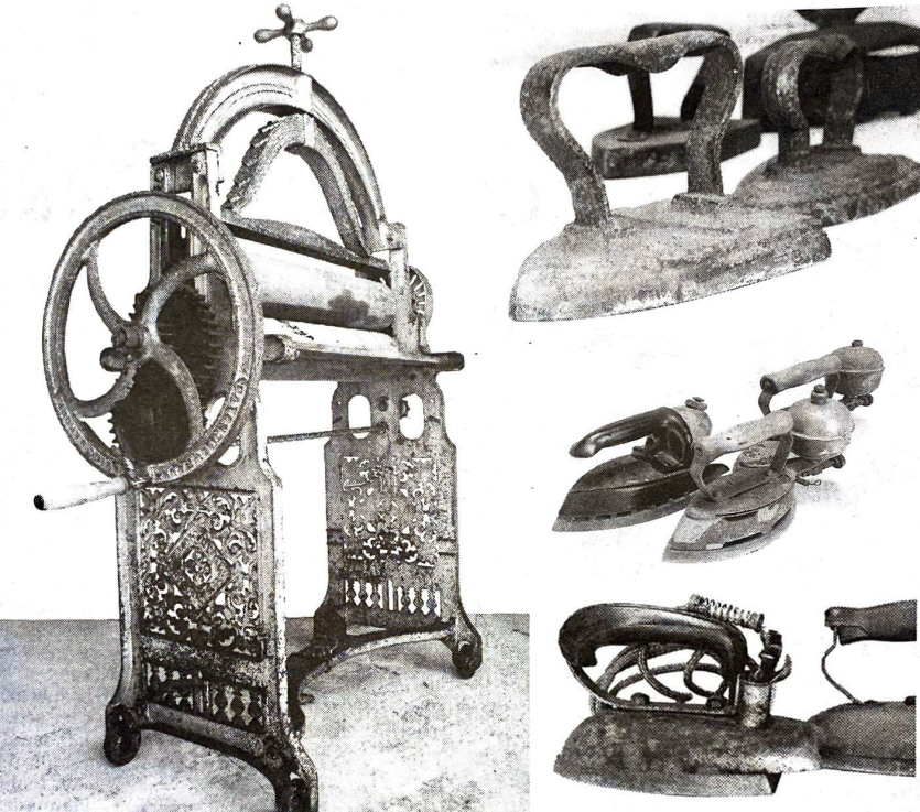 Les fers à repasser du début d’un siècle n’étaient guère plus qu’une semelle de fonte en forme de barque, dont la partie inférieure était polie et la partie supérieure équipée d’une poignée, fondue dans la masse ou en fer plat vissé. Évidemment, on y enroulait un chiffon pour ne pas se brûler puisqu’il fallait, avant de repasser, mettre le fer à chauffer sur un "potin" à charbon, une sorte de petit poêle portatif. Il fallait aussi, à chaque fois, nettoyer la semelle à la cire d’abeille sur un chiffon propre.
