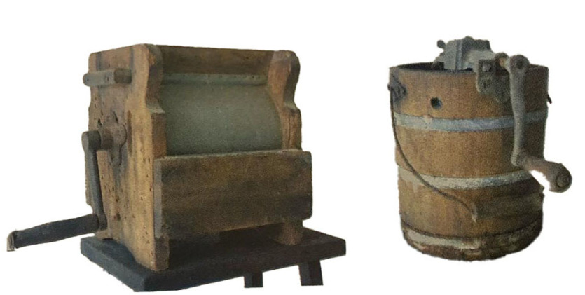 Il existe bien des modèles de baratte à beurre. Les deux présentées ici sont radicalement différentes. Celle de gauche sur la photo, la plus grosse, en bois, est à axe horizontal. La plus petite (à droite), en verre, format familial, est à axe vertical. Mais dans les deux cas, il faut là encore tourner la manivelle pour mouvoir des palettes rotatives et séparer la crème du petit-lait.