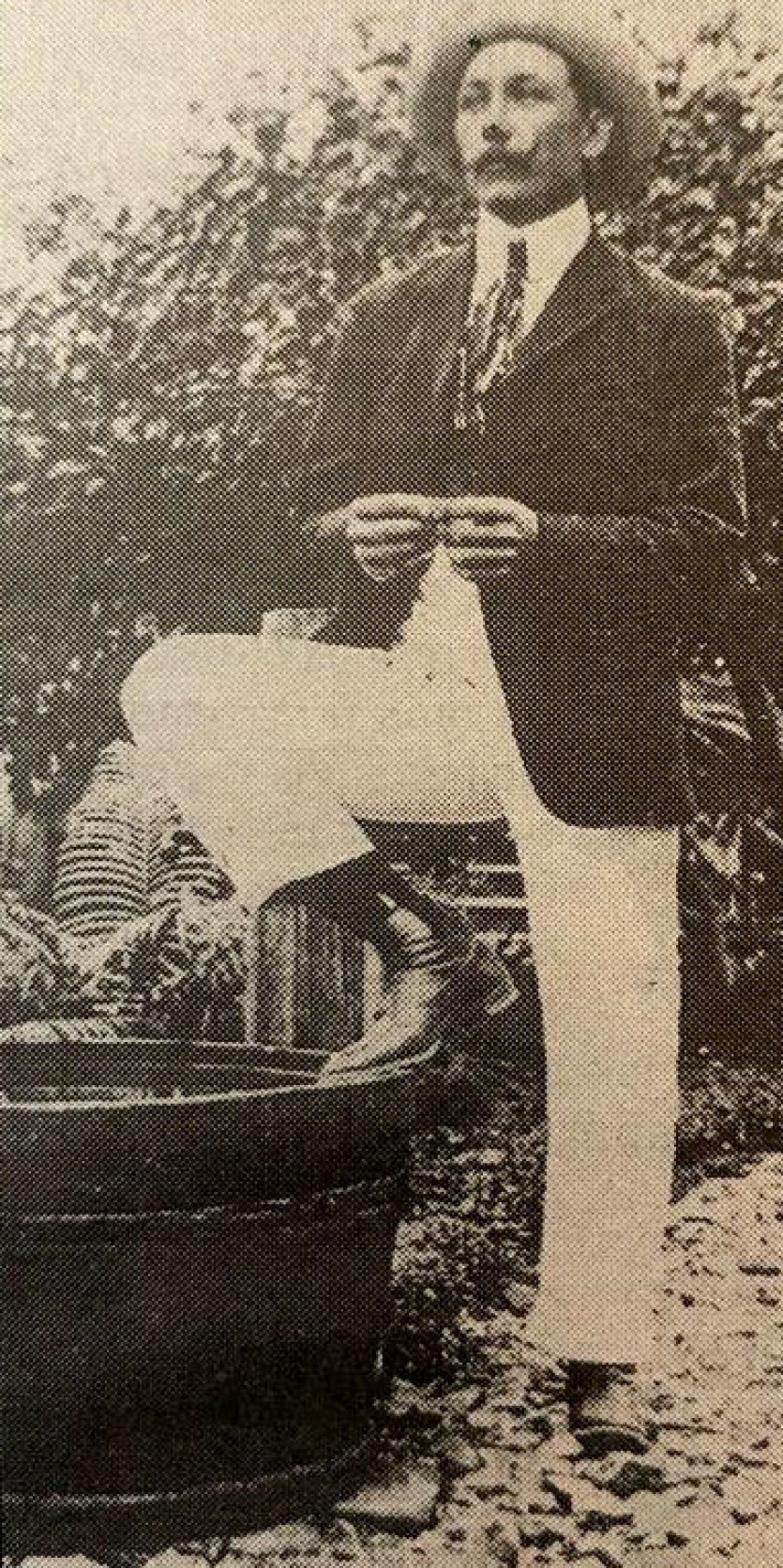 Il fut un temps où la baille était un récipient multi-usages dans la plupart des maisons calédoniennes. Elle permettait même de prendre une pose avantageuse pour se faire photographier… Photo DREt la bouteille carrée…