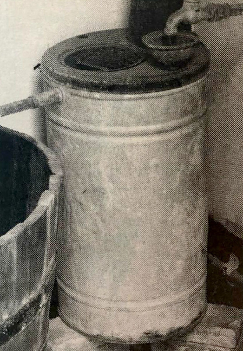 Un luxe pour frileux du début du XXe siècle : le chauffe-bain. L’eau froide circulait dans un serpentin à l’intérieur de ce réservoir que l’on remplissait de braises. L’ancêtre du chauffe-eau. Photo DRLa moque