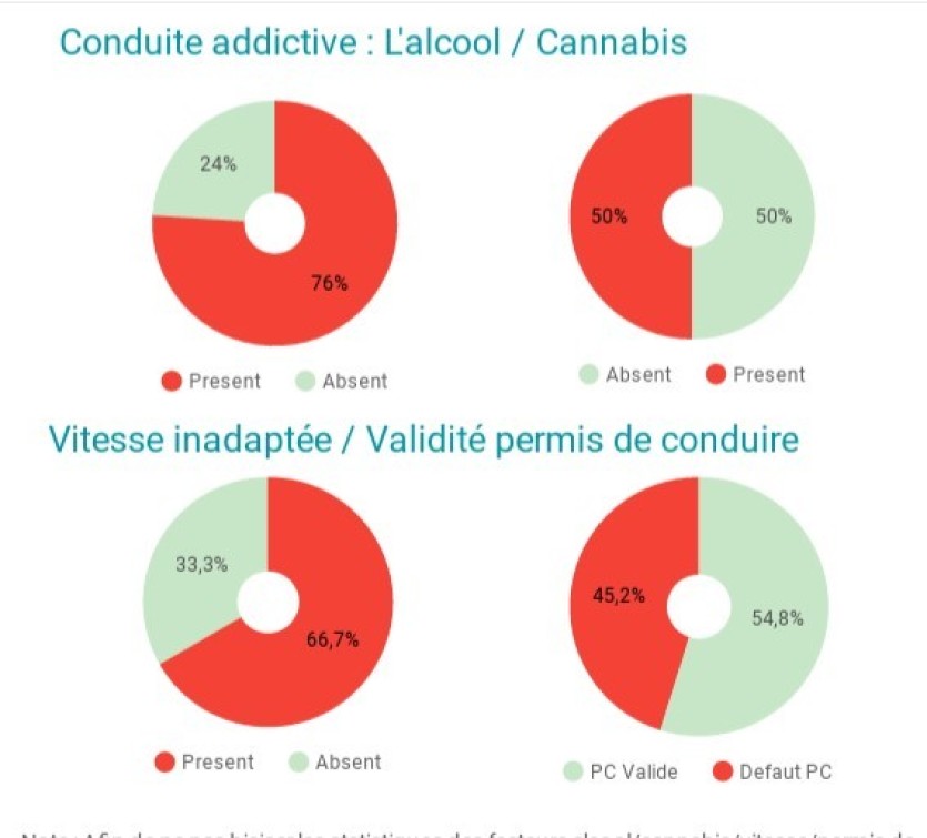 Par ailleurs, la vitesse excessive (67 %) et le défaut de permis de conduire (45 %) restent également à des niveaux élevés.