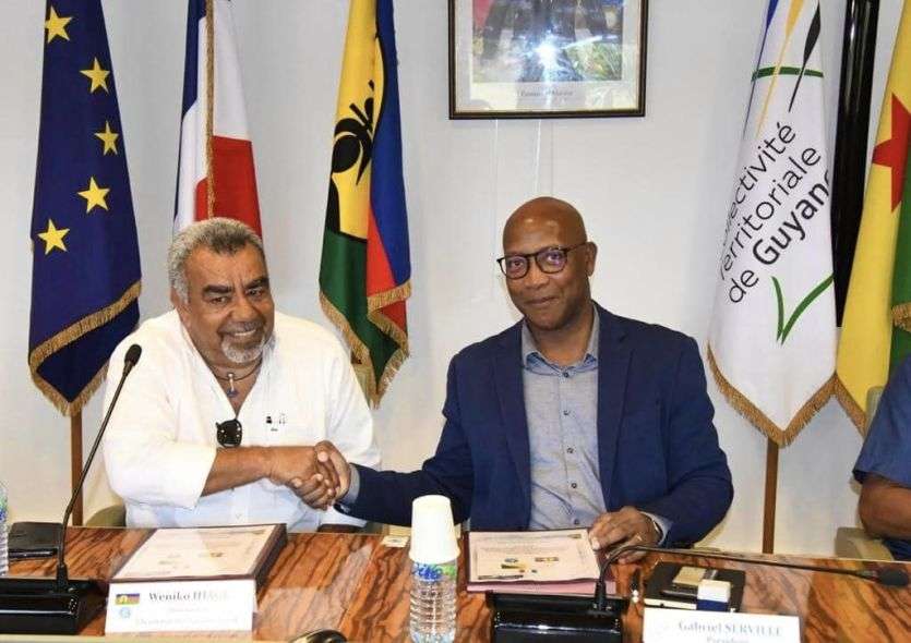 - | Crée le 14.11.2023 à 10h55 | Mis à jour le 14.11.2023 à 10h55ImprimerWeniko Ihage, le directeur de l’Académie des langues kanak, et Gabriel Serville, président de la Collectivité territoriale de Guyane. Photo DRUne délégation de l’ALK était en visite en Guyane la semaine dernière. L’impact sociétal et la sauvegarde des langues régionales étaient au centre de cet échange préconisé lors des états généraux du multilinguisme de 2021. Il s’est notamment soldé par la signature d’une déclaration commune en faveur d’une académie des langues régionales.