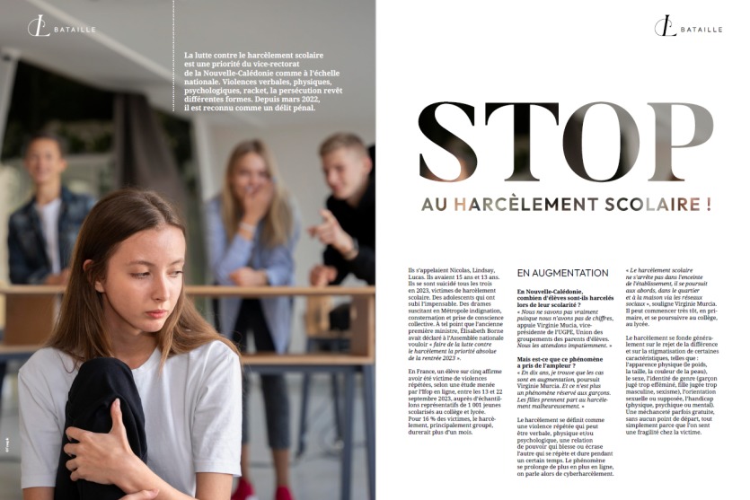 - Frédérique de Jode / L Calédonie | Crée le 21.04.2024 à 05h00 | Mis à jour le 21.04.2024 à 10h34ImprimerDans l’Hexagone, un élève sur cinq affirme avoir été victime de violences répétées. Sur le Caillou, impossible d’avancer des chiffres car aucun sondage ni étude n’ont été réalisés sur le sujet. Photo DRViolences verbales, physiques, psychologiques, racket, le harcèlement scolaire revêt différentes formes. La lutte contre cette persécution, qui est reconnue comme un délit pénal depuis mars 2022, est une priorité du vice-rectorat de la Nouvelle-Calédonie comme à l’échelle nationale. Un dossier réalisé par Frédérique de Jode pour notre partenaire, le magazine L Calédonie.