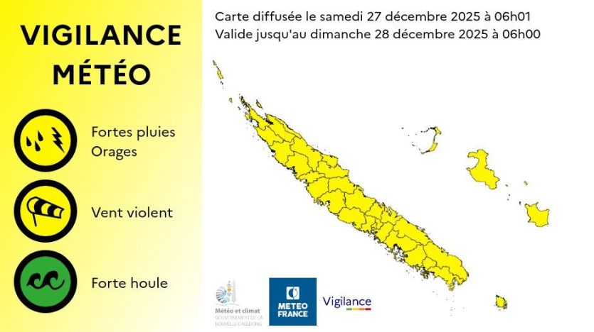 - Baptiste Gouret | Crée le 27.12.2025 à 08h47 | Mis à jour le 27.12.2025 à 08h49ImprimerL'ensemble du pays a été placé en vigilance jaune aux fortes pluies et vent violent, ce samedi 27 décembre. Carte Météo FranceMétéo France a placé les 33 communes de Nouvelle-Calédonie en vigilance jaune. Des rafales jusqu'à 40 nœuds sont attendues, ainsi que de fortes averses parfois orageuses.