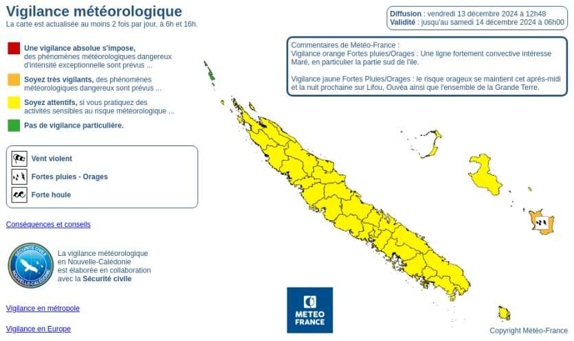 - Baptiste Gouret | Crée le 13.12.2024 à 14h29 | Mis à jour le 13.12.2024 à 14h29ImprimerUn épisode orageux touche la Nouvelle-Calédonie ce vendredi 13 décembre. Plus de 200 mm de précipitations sont attendus à Maré. Carte Météo FranceDans son bulletin de la mi-journée, Météo France prévoit l’arrivée de puissants orages qui concerneront l’ensemble du territoire. Entre 200 et 250 mm de pluie en six heures sont attendus à Maré.