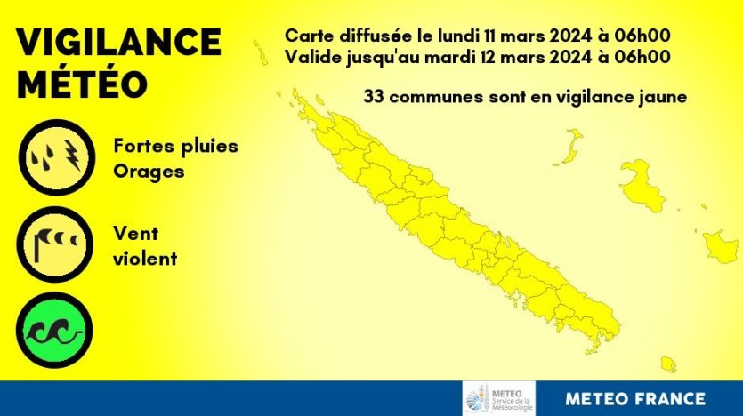 - Baptiste Gouret | Crée le 11.03.2024 à 07h38 | Mis à jour le 11.03.2024 à 07h38ImprimerLes 33 communes de Nouvelle-Calédonie ont été placées en vigilance jaune aux vents violents. Carte Météo FranceMétéo France a placé les 33 communes du Caillou en vigilance jaune en raison d’un alizé de Sud-Est pouvant générer des rafales jusqu’à 45 nœuds, ce lundi.
