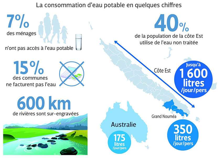 - Par Anthony Tejero | Crée le 19.10.2018 à 06h35 | Mis à jour le 19.10.2018 à 06h41ImprimerLe gouvernement estime par ailleurs que deux tiers des communes ne garantissent pas d’eau potable et propre toute l’année. Infographie : Patrica CrezenC’est une première. Le gouvernement a dévoilé les chiffres sur les usages et les ressources en eau en Calédonie. Le constat est alarmant. Menaces environnementales sur la majorité des captages et rivières, gaspillage en ville comme en Brousse, méconnaissance du milieu naturel... Autant de raisons qui ont poussé les élus à lancer une politique de l’eau partagée.